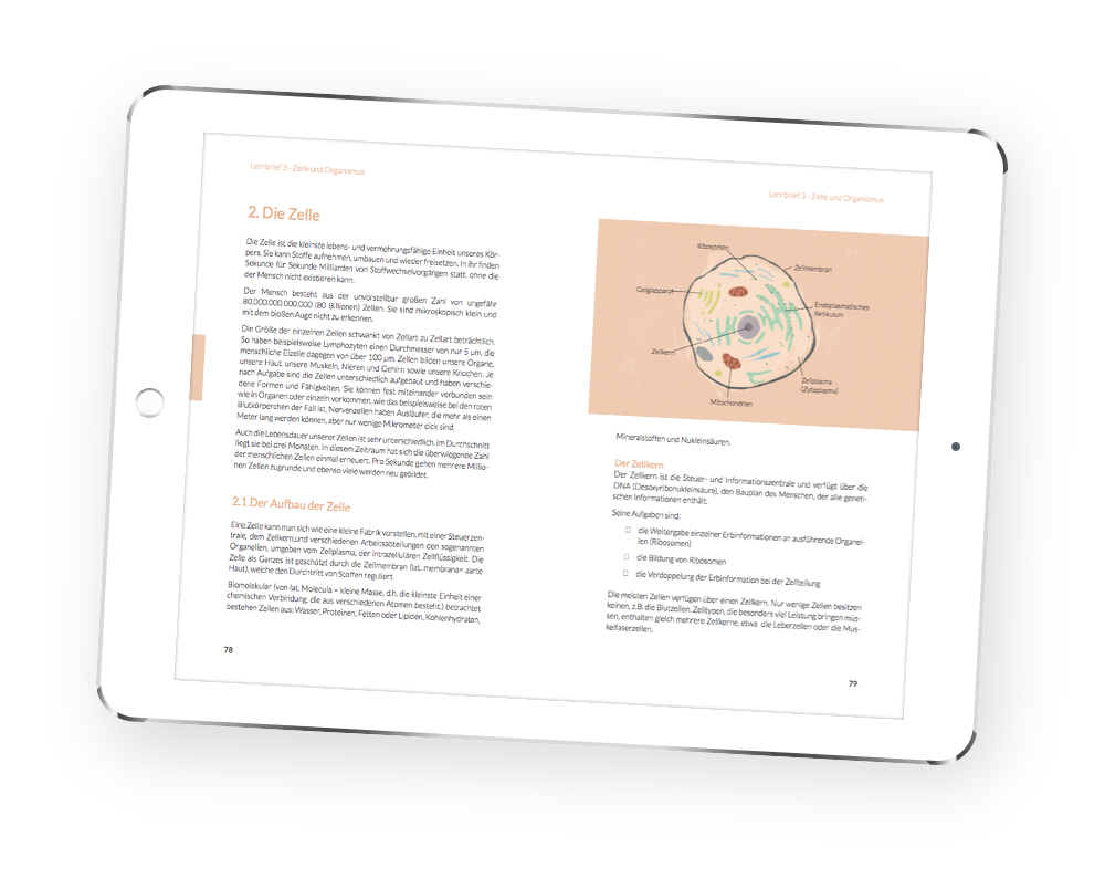 Das Herzstück der Ausbildung bilden übersichtlich gestaltete Modulhefte und ein Praxisbuch, die dir Schritt für Schritt das nötige Wissen vermitteln. Du erhältst sie bequem per Post – und zusätzlich digital in unserem modernen Online-Lern-Campus.