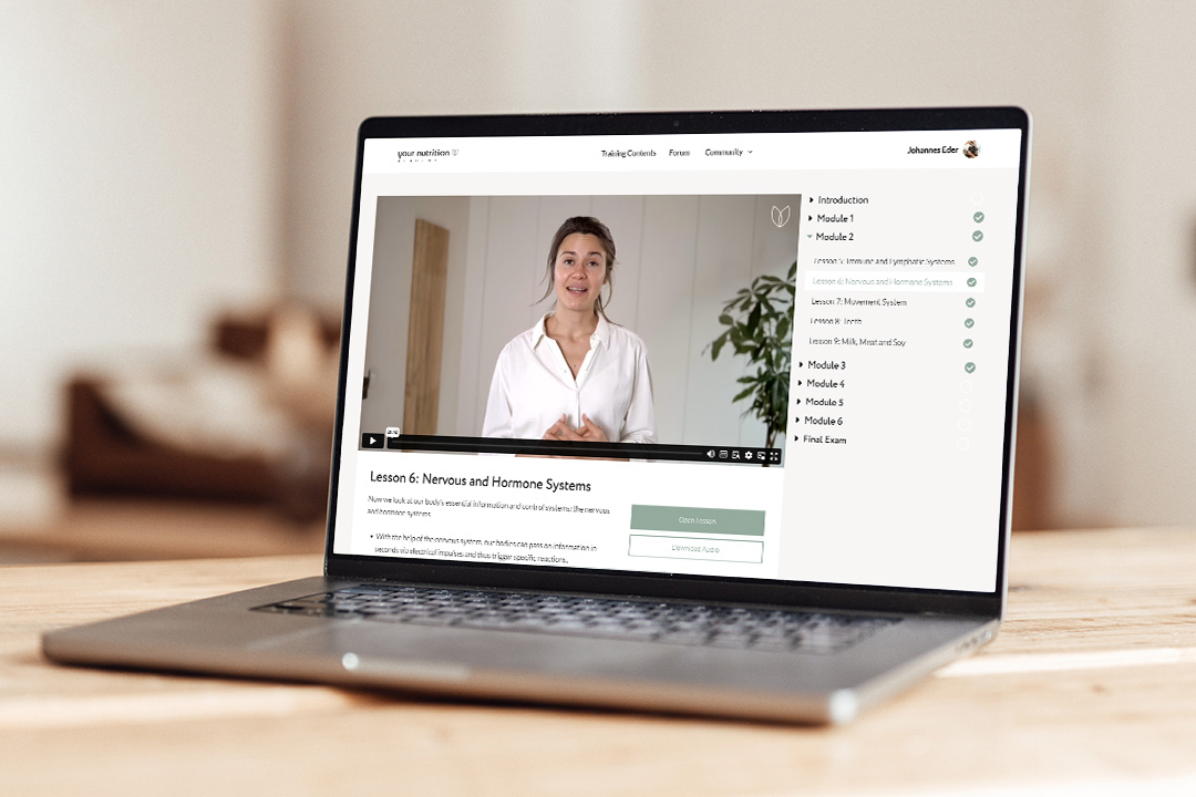 The training program combines medical science with holistic knowledge of physiology and nutrition in 28 lessons. Students also benefit from monthly live Zoom meetings (with four required sessions), a practical video preparation course, and six optional, topic-focused PLUS modules for deeper learning.
